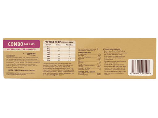Available in 12 x 115g individual patties Combo for Cats is a mixed protein recipe containing, chicken, beef, lamb and Tasmanian Salmon. With more ...