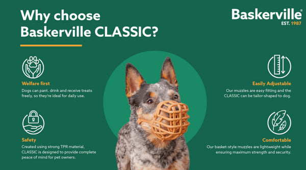The Baskerville Classic Muzzle is crafted from upgraded Thermoplastic Rubber (TPR)—4x stronger and more durable than traditional plastic, yet lighter and more comfortable. The material can be reshaped in hot water for a custom fit tailored to your dog.