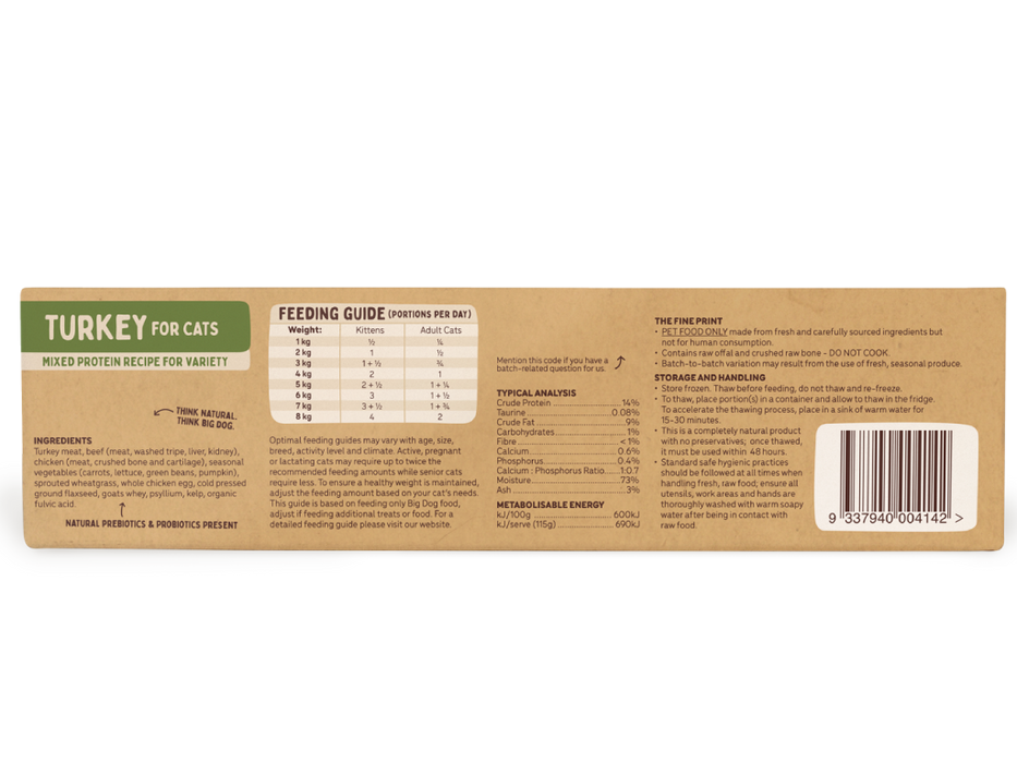 For a lighter flavour, your cat may prefer our turkey recipe. This recipe features turkey as our primary protein, along with chicken and beef for nutritional variety. To this, there is biologically appropriate amounts of seasonal vegetables, sprouted wheatgrass, whole eggs, and kelp, just to name a few. Your tiny carnivore will gobble this one up!